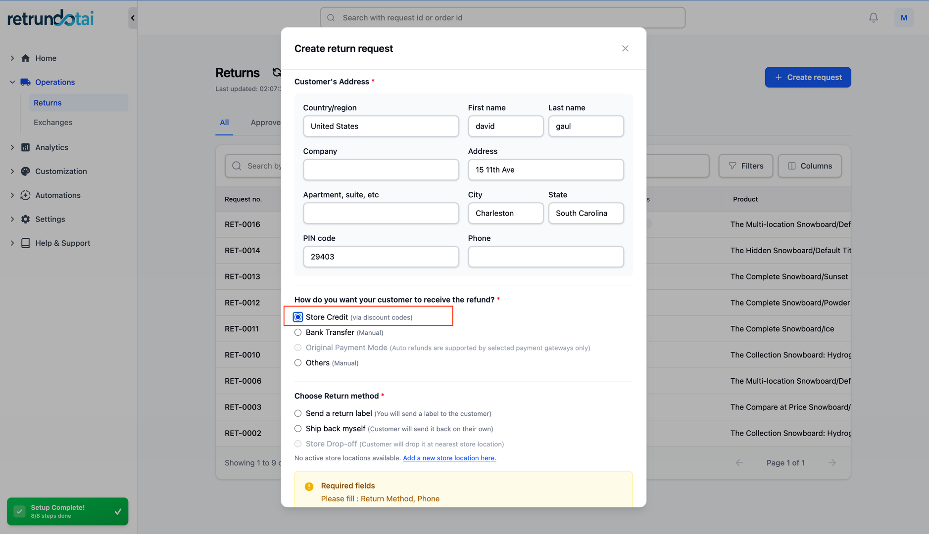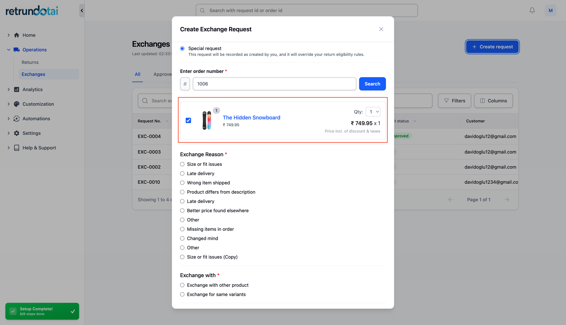 This feature allows merchants to manually create and manage return and exchange requests directly from their dashboard, streamlining the process for both merchants and customers. Whether handling phone orders, special cases, or providing concierge service, you can initiate returns and exchanges on behalf of your customers.