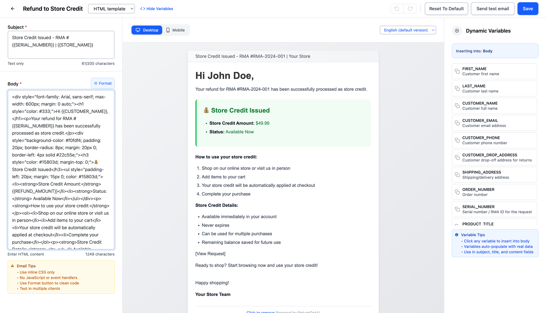 Returndotai automatically emails customers when store credit is issued for their returns using the "Store Credit request refunded" template.