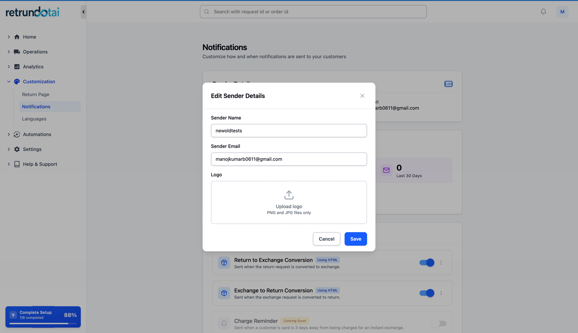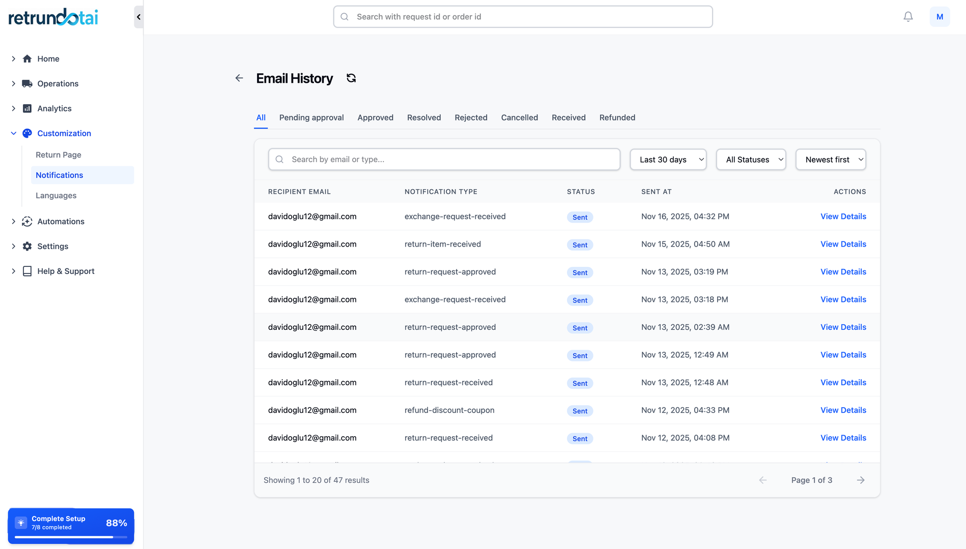 The notifications for the return/exchange process are standardly set up to be sent to your customers for tracking the status of the return requests. This automated email system keeps customers informed at every stage of their return or exchange journey, from initial submission to final resolution.
