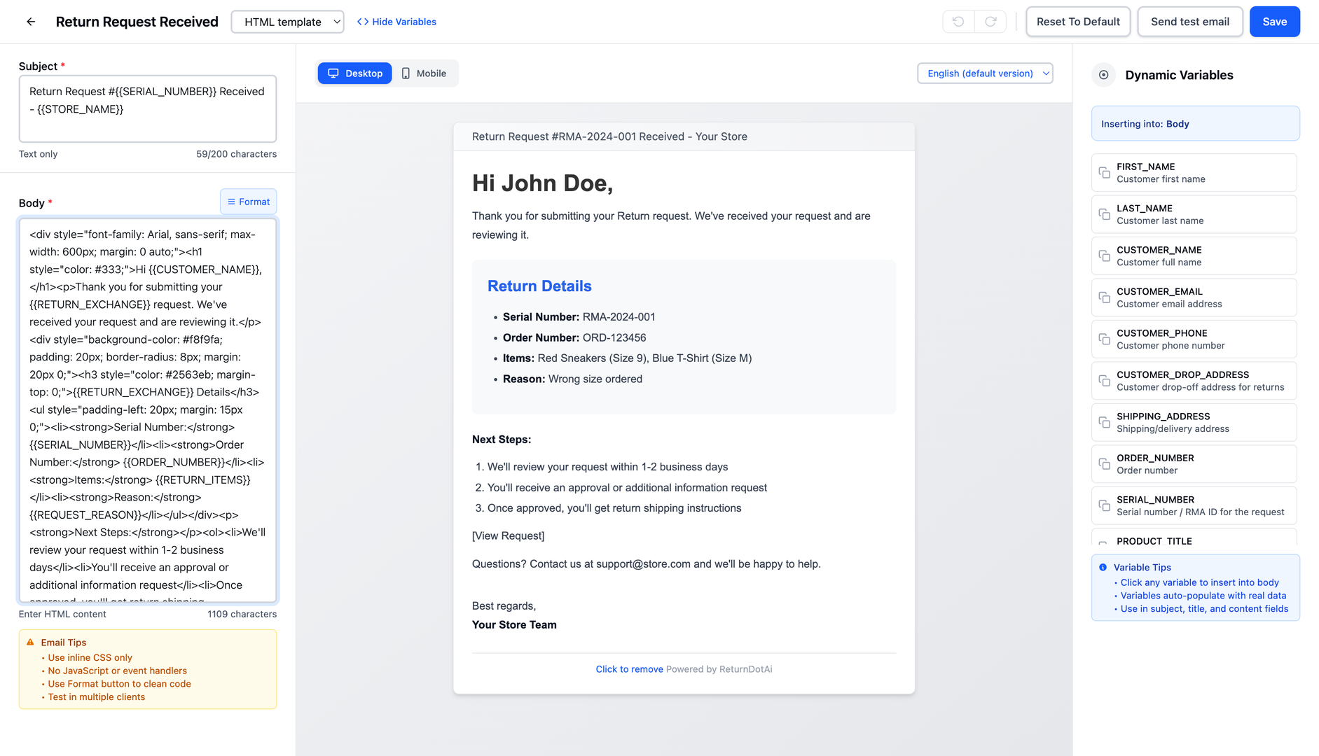 Customize your email templates to include helpful information like return policy reminders, customer service contact details, and expected timelines.