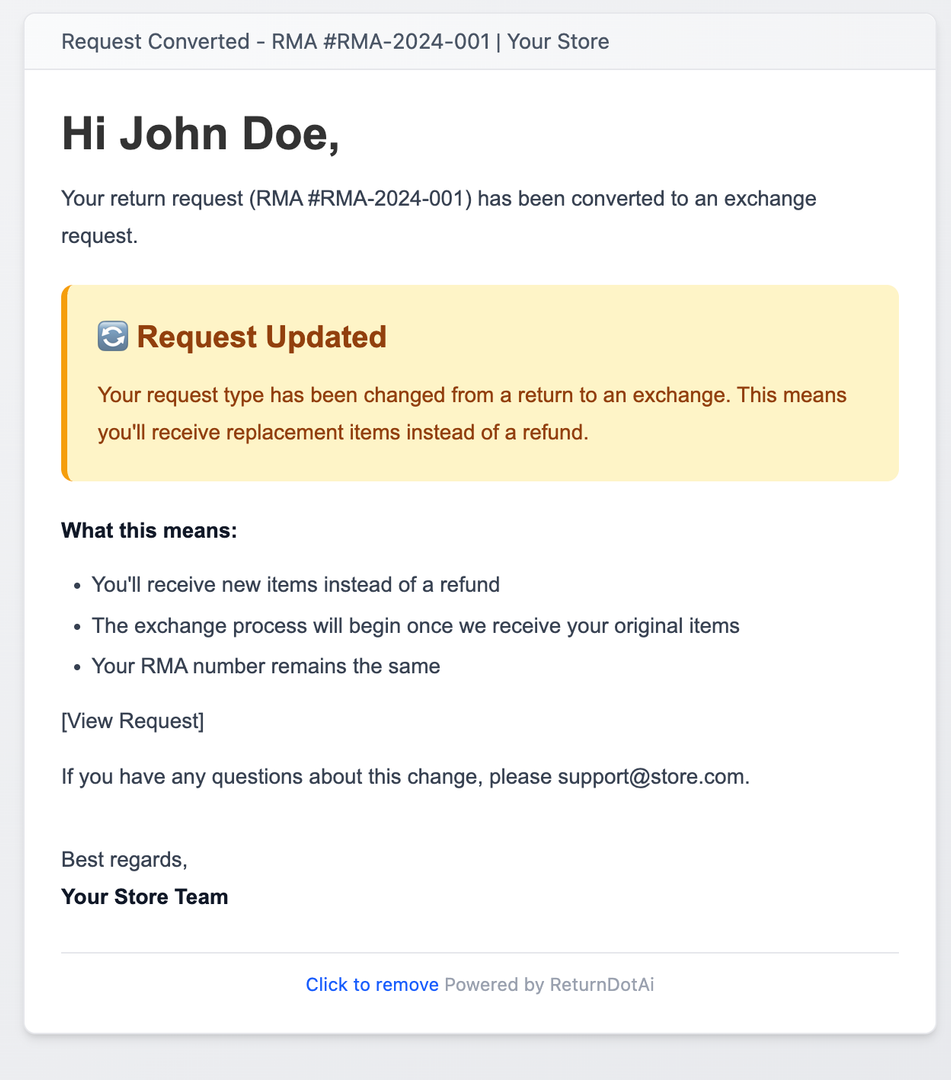- 1Exchange Request Submitted - Confirmation email sent when customer submits the exchange