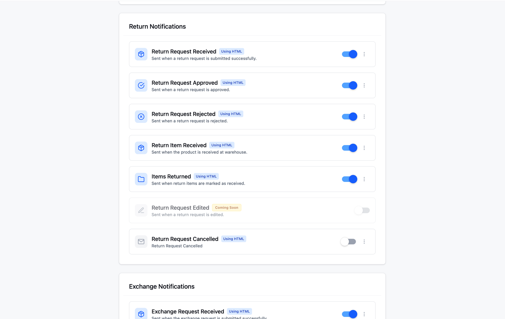 The system provides pre-configured notification templates for each stage of the return and exchange process. You can enable or disable each template individually based on your business needs.